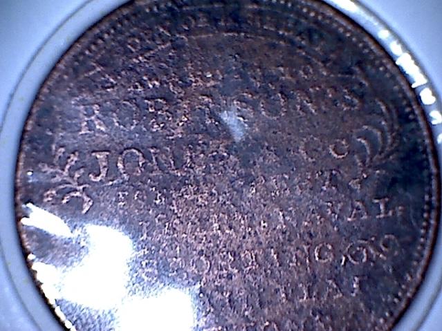 Reverse of the 1833 Robinson's Jones & Co. Hard Times Token. States "Robinson's Jones & Co. For Military, Naval, Sporting, and Plain Flat Buttons"