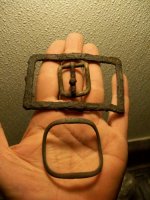 a nice one piece button,2 colonial shoe buckle frames.one is iron the other brass. a #1 small crotal bell
