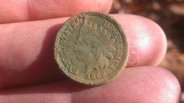 My first target was a nice old dandy button right off the bat. Started rolling logs and kicking fallen branches when underneath a large fallen branch I got a low vdi reading in the shotgun range. Surprisingly I found a small pocket spill with two fatty Indian Heads stuck together, both dated 1863. Targets were getting hard to come by when I got a mid 50's VDI reading on the side of a small sloped hill about a 100ft from the cellar hole. As Dave was walking over to me I told him that I have a nice repeatable target as he watched me pull out my 4th George Washington Inaugural button of the year.:yahoo: It was another Eagle with Star and my third one of this variety. Then just as we were leaving I pulled another eagle button from the site which is a General Service button.