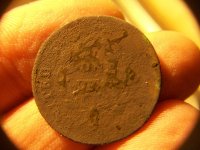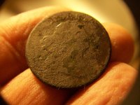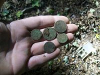 Todd & myself found a few new sites.I had a good feeling about the 1st site even before we got there due to its location.bright & early we got there. As soon as we turned on our machines IH's started popping.between the 2 of us we pulled 14 coins from this site.I got the lone copper.the rest were all mid 1800's coins.we stopped at a road side site and not much there but a lone lead knight & compact.then onto last site I got the saddle shield.Todd got an unexpected suprise at the last site.which we dont know what kind of site this was? no foundation just some walls and a weird stone formation we saw on the aerial which basically looked like this ( ) turns out it was up on a mountain top and very secluded. all we can figure is that it was possibly some type of meeting location of Separatist or Masons? never seen anything like this in all my years of foundation hunting :dontknow: