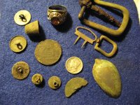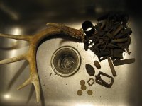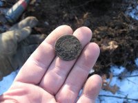 1st site i hit the 1787 Fugio.my 1st copper of 2013,then he got his dandy find .a few buttons here and there.we then decided to try the 2nd site.nothing but trash there,seems like it was a party spot.found the deer shed antler there.a foot away from a bud light can i got a ring signal. i almost didn't dig it figuring another pull tab.so glad i did! a pretty heavy 10kt gold mens class ring.we finally hit the 3rd site and i got some clad,a wheatie and a 1943-D merc.was a great hunt and was especially happy for Todd.i walked by it 5 feet away from his find,I think he woulda killed me if i had dug that >:tongue: