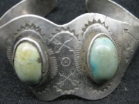 Found this today. About 4 deep. It is positive for sterling silver. There are no marks on the inside of the bracelet. Weighs 32.6 Grams as is. Turquoise is pretty faded, been in the ground a long time. Someone mentioned that since it was not marked it was probably made before 1906. Pretty sure it was made by Native Americans. Wondering how to find out for sure what tribe and roughly when. Any help would be appreceated. Thanks.